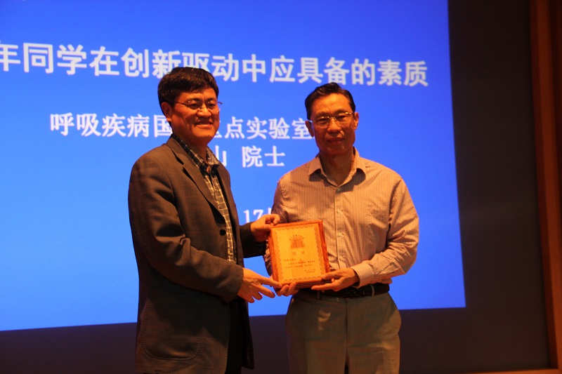 接着,钟院士开始了题为《创新素质的培养》的精彩报告。钟院士从“创新”和“创新驱动对人才素质的要求”两个方面进行了精彩的演讲。他指出真正的创新不只是发表学术论文,而是要更注重其实际意义,并从“执着追求”、“尊重事实”、“崇尚诚信”、“合群协作”和“健康体魄”这五个要素精彩诠释了创新驱动对人才素质的要求。钟院士结合自己最初研究慢性阻塞性肺病的经历,告诉同学想成为一个创新的人才,首先是要有执着的追求,很多事情是从责任的“要我做”到培养兴趣再到热爱和成为追求的学会“我要做”。关于“尊重事实”,钟院士举了当年抗击非典时研究支原体的例子,告诉学生权威的意见不一定是对的,自己的实践或者是亲眼看到的是可信,一定要尊重事实。关于从“崇尚诚信”,钟院士结合英出版商近期撤销43篇造假论文事件,告诫学生成为一名科学家的底线就是不能作假,诚信是创新的必备素质。关于“合群协作”,钟院士认为重大的创新是协作,协作的前提是共赢,协作的成功靠号召力。他结合年轻时去英国留学的例子,告诉学生人天生需要别人尊重,在与人合作中,最重要便是尊重他人。关于“健康体魄”,钟院士酷爱运动,曾是一名运动健将。今年已经年近八旬,依然精力充沛,坚持体育锻炼,奋斗在临床教学科研第一线。他告诫同学们,“不要忘记,你们现在有很强的潜力,所以你熬夜或者不吃饭、不睡觉,还可以熬。但是到你40岁、50岁的时候你就感觉到(精力不济)。所以我希望大家一直维持精力旺盛,很好地从事你的研究工作。希望在座的同学都把自己培养成一个创新型的人才”。在问答环节,同学们踊跃地提出了许多与医疗制度、科研等相关的问题,钟院士一一给出了详细的回答。