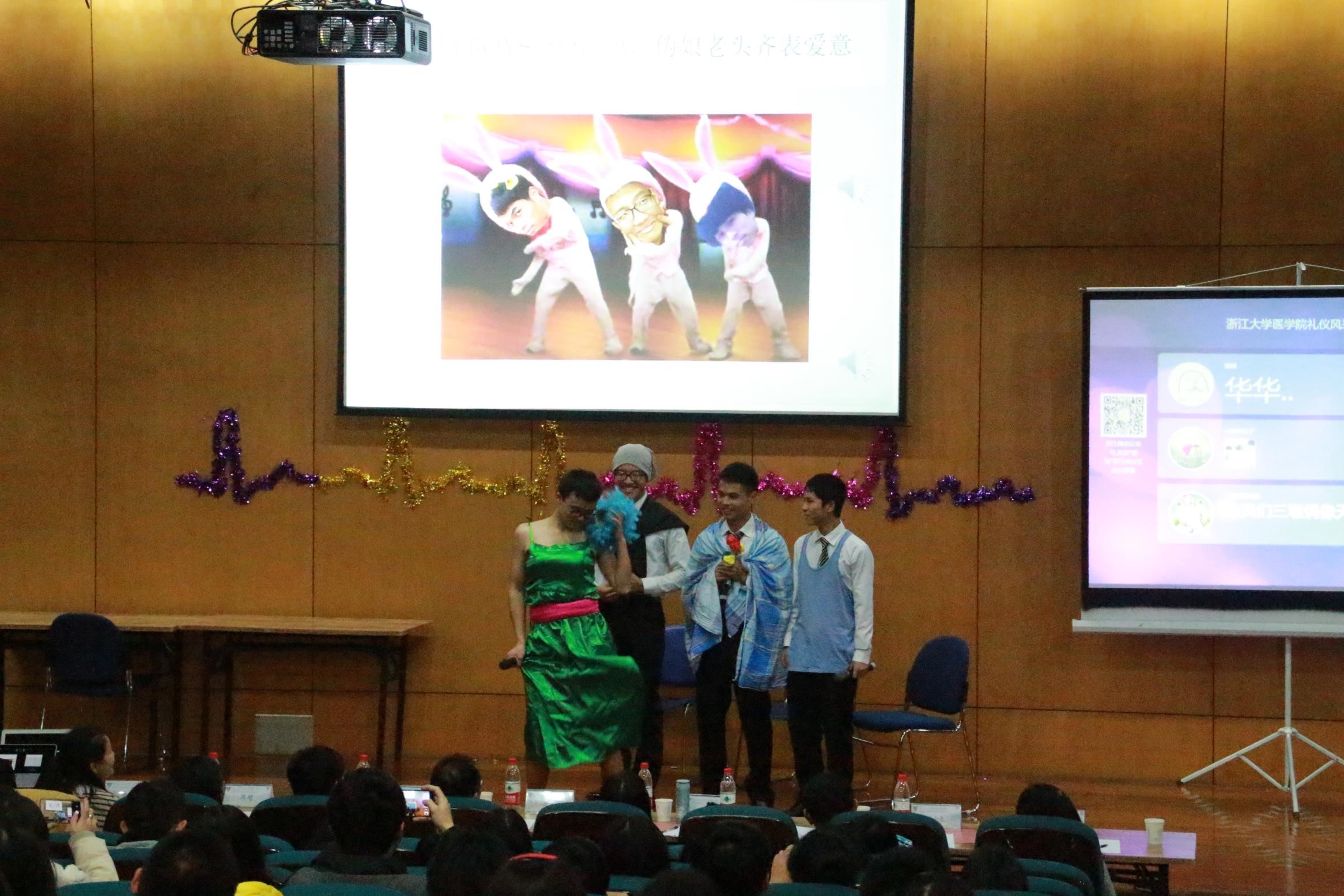 咦,是谁出场,引出了这么响的欢呼声?原来是来自临床1306班的国际巨星wuli boys,和“牺牲”巨大的反串表演。一席鲜艳的绿色长裙,惟妙惟肖的兰花指,蒙蒙同学一出场就引起了轰动。夸张的动作,诙谐的语言,wuli boys巨星艰辛的成名之路笑点满满。