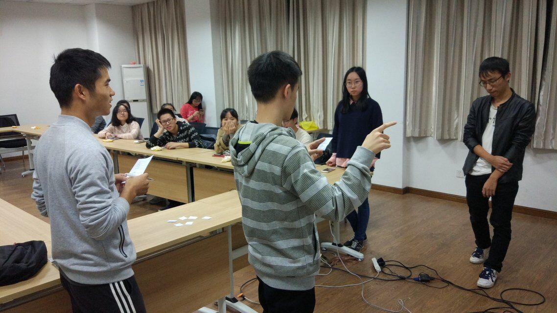 最后活动环节本来是“你画我猜”游戏,由于设备问题临时改成“你说我猜”或“你做我猜”,反而增添了更多趣味。内建委员钭赉振和张黎悦设计了阴阳师组、明星组、学霸组、歌名组四大区块,让爱好不同的同学们都有机会参与游戏,情侣组合、闺蜜组合、基友组合、现场点名组合等等,到了真正考验大家默契的时刻。最终各个组的胜出组合进入决赛PK,决赛猜的是班级里的同学,考验的是班级同学间的互相了解与认识,各种有趣的、逼真的模仿让下面的群众笑的停不下来。