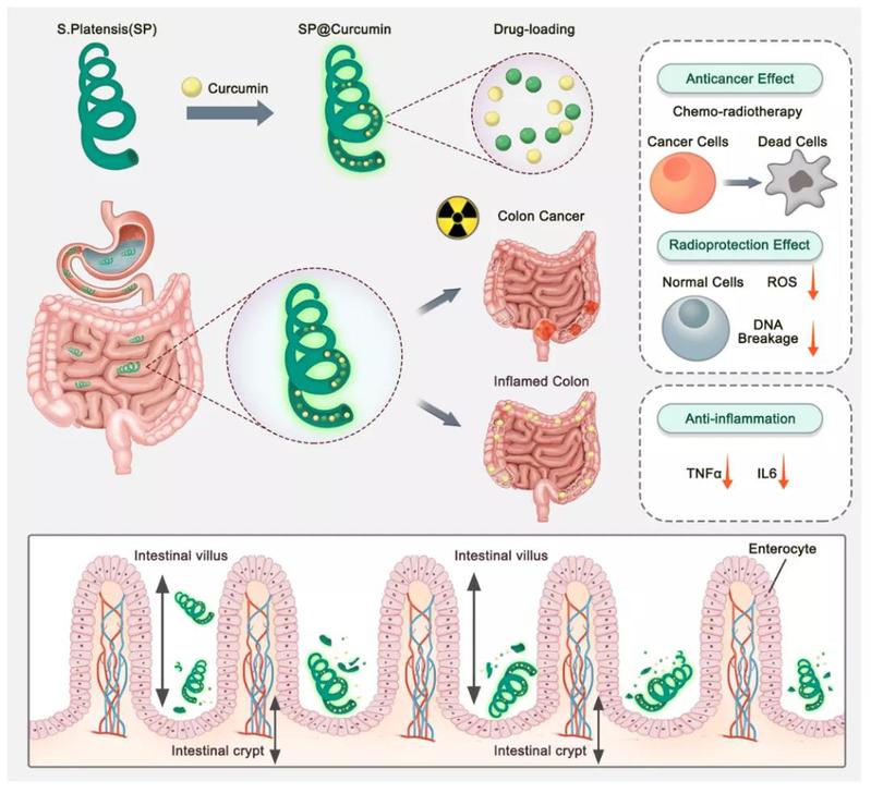 载姜黄素螺旋藻介导的结肠癌放化疗联合治疗及对肠道炎症的抗炎作用示意图