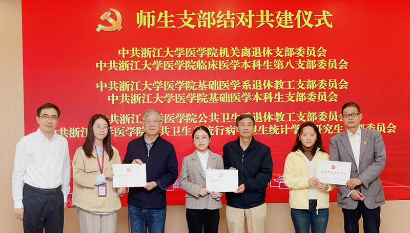 夏标泉为师生结对共建支部颁发证书,本次共有机关离退休党支部、基础医学系退休教工党支部、公共卫生系退休教工党支部与基础医学本科生党支部、公共卫生系流行病与卫生统计学系研究生党支部、临床医学本科生第八党支部三个学生支部开展结对共建。